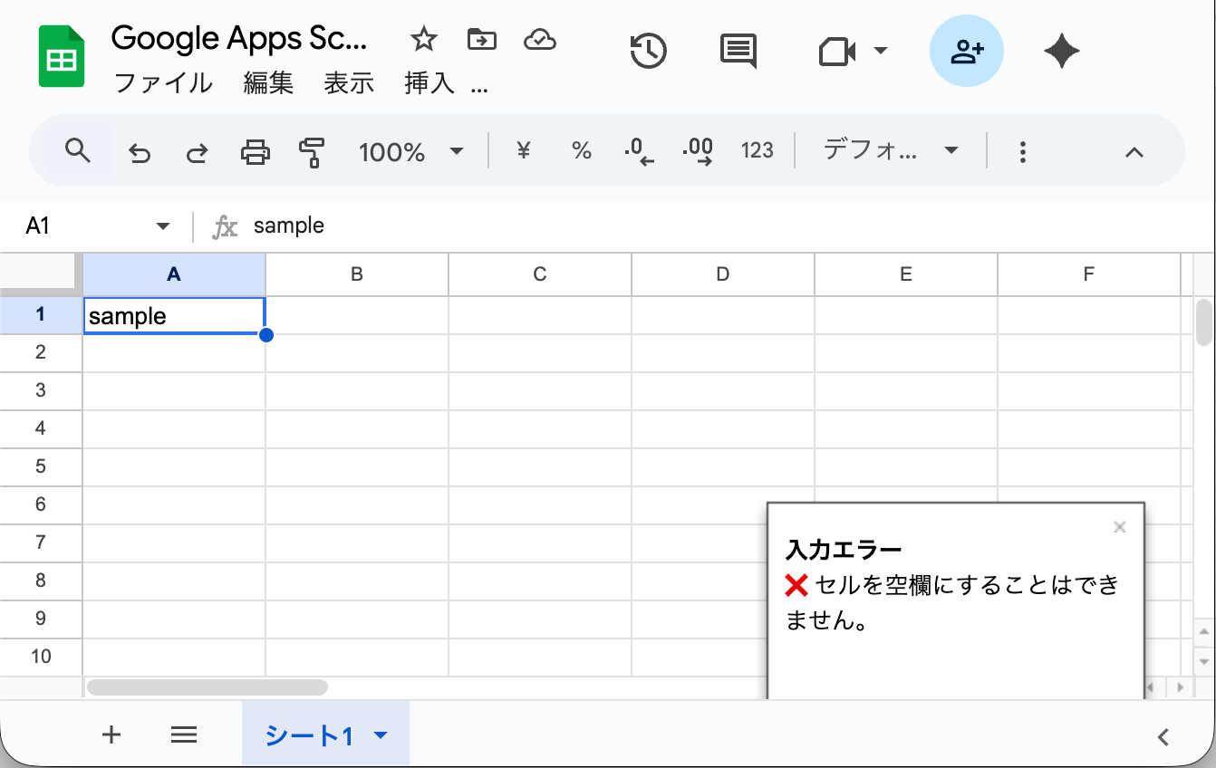 }このコードが保存されていれば、例えば「sample」と入力されているセルがDeleteで空白になった場合は下図のようにトーストで「❌️ セルを空欄にすることはできません。」という入力エラーが表示されて、セルの値が「sample」に戻ります。